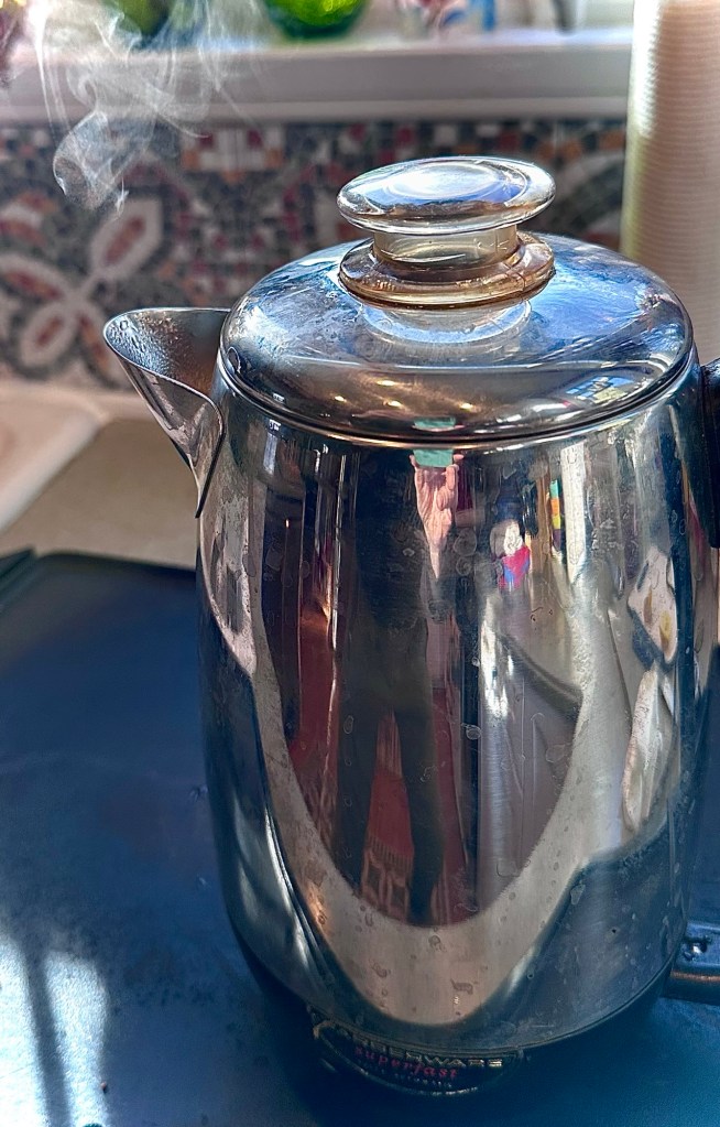 The Farberware pot sits in utter peace most of the year, but if there are birthday or holiday guests, it leaves the cupboard, its chrome polished, 8 cups of cold water, 9 teaspoons of coffee added and plugged in.